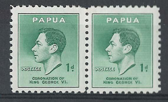 #0948 Papua 1937 Coronation 1d ‘Halo’ flaw in pair with normal sg154 f mint c£25