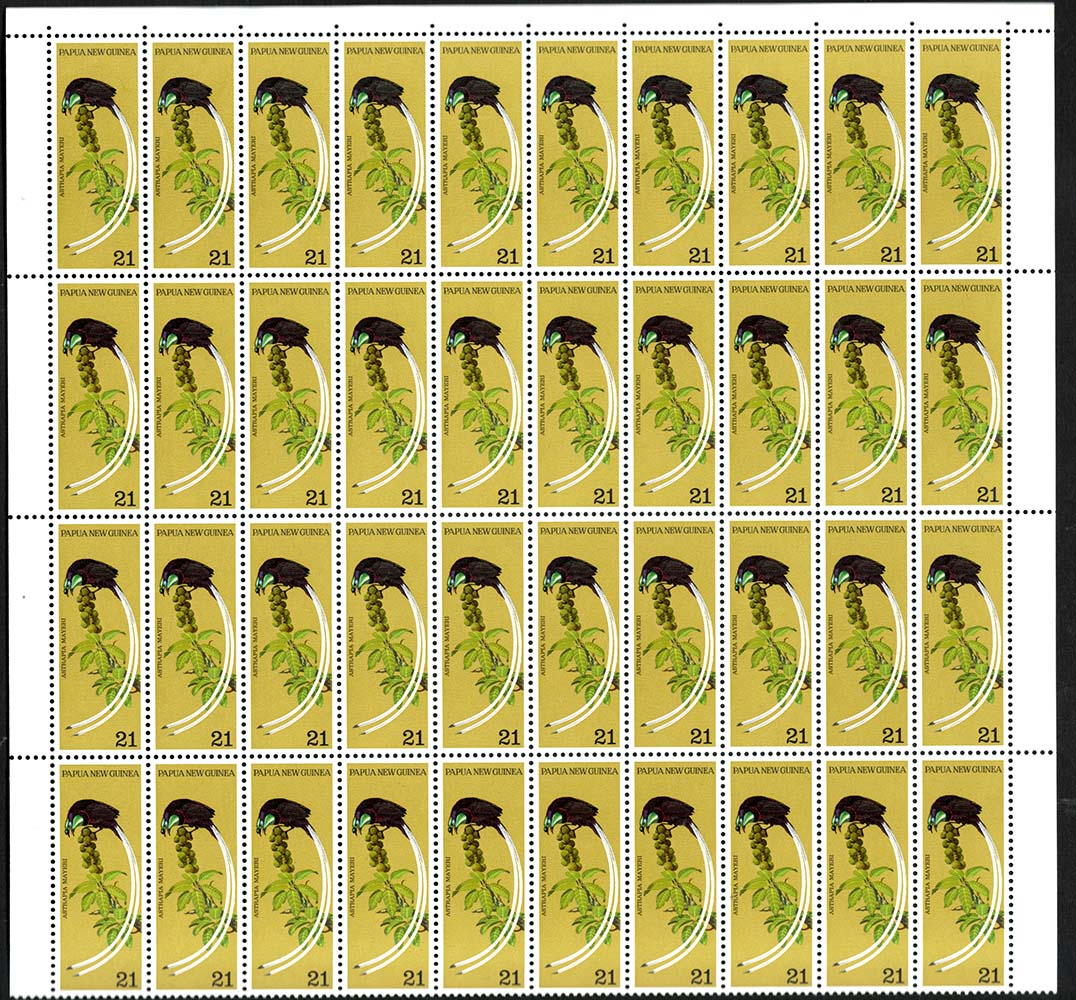 Papua New Guinea 1973 Birds: 21c Bird of Paradise sg239 unmounted mint block of 40 (top 4 rows of sheet) ?varieties cat £90 [ref ebay/1298-l 4w2250] 291/#945