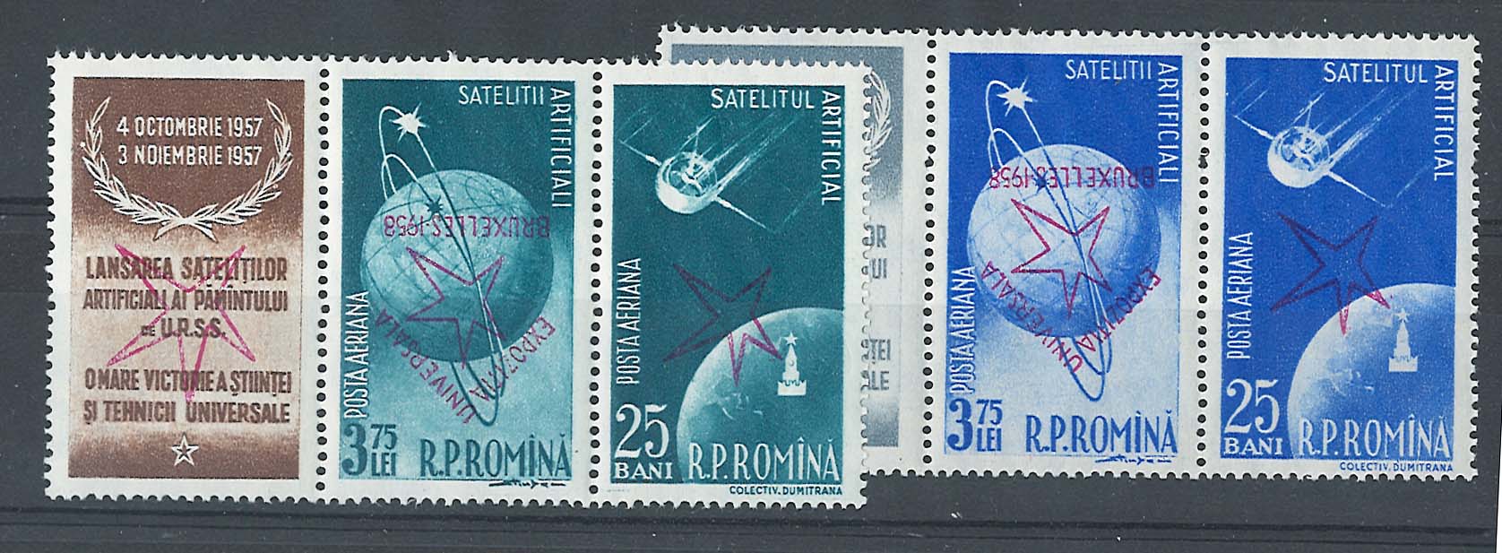#0975 Romania 1958 Brussels International Exhibition inverted ovpt strips of
