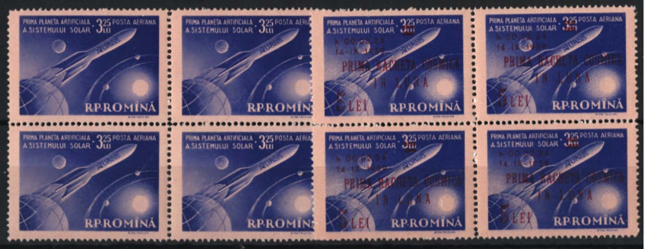 Romania 1959 First Cosmic Rocket sg2631 um blk of 4, minor separation, ditto with red ovpt sg2662 c£122