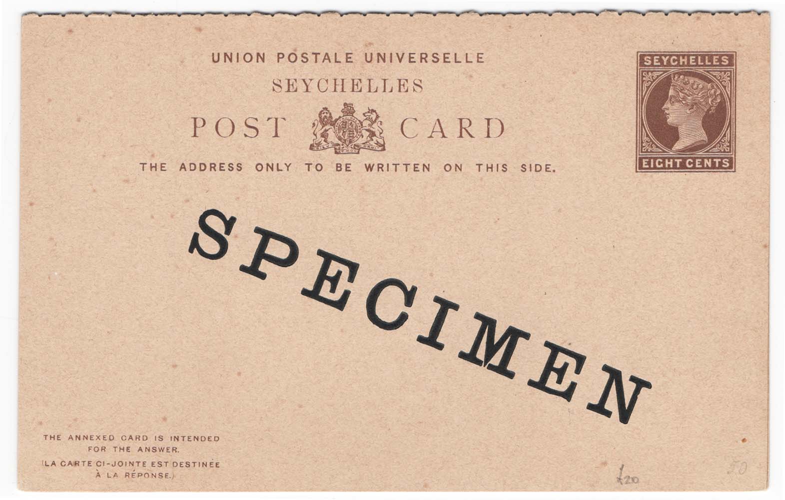 Seychelles 1890 Reply Card 8c + 8c dark brown on buff with SPECIMEN overprint, 139x89mm, fine unused [ref 287bb2278/bstr/9w1091]