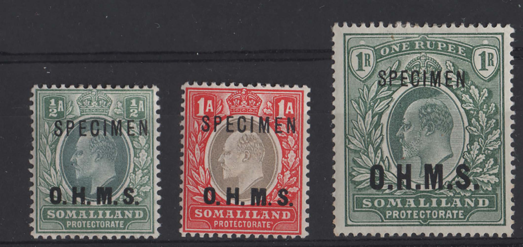 Somaliland 1904 OHMS ½a, 1a & 1r ovpt Specimen vf mint sgO10-11, O15 (a normal 1r is c£275) [ref 287bb2324/sae/9u0456]