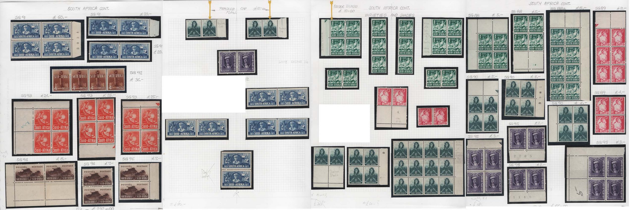 South Africa 1941 Large War Effort mainly um specialised lot on leaves, several pieces with pencil annotations re varieties c£370 as basic pairs sg88-96