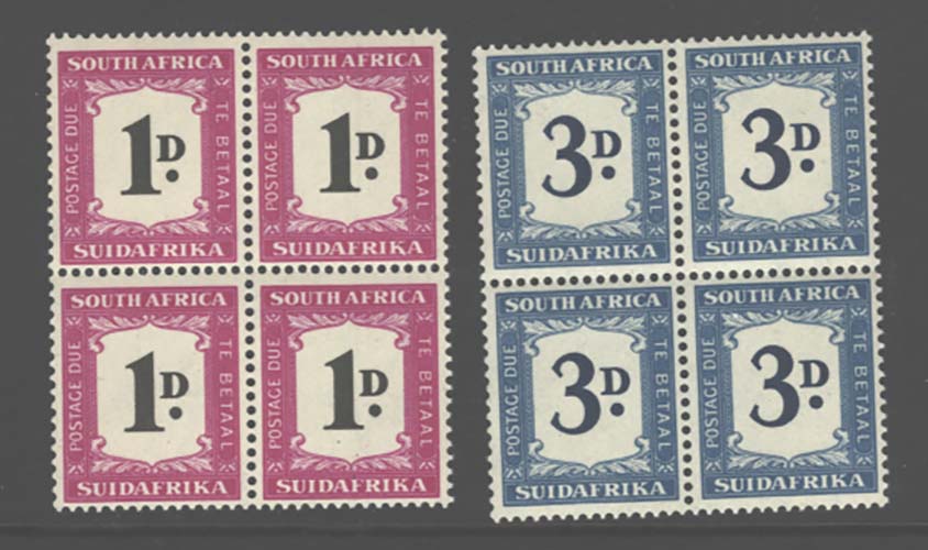 South Africa 1948 1d, 3d Postage Dues sgD35, 37 g-fine um blocks of 4 cat £128 [ref 287bb2340/sae/5m2778]