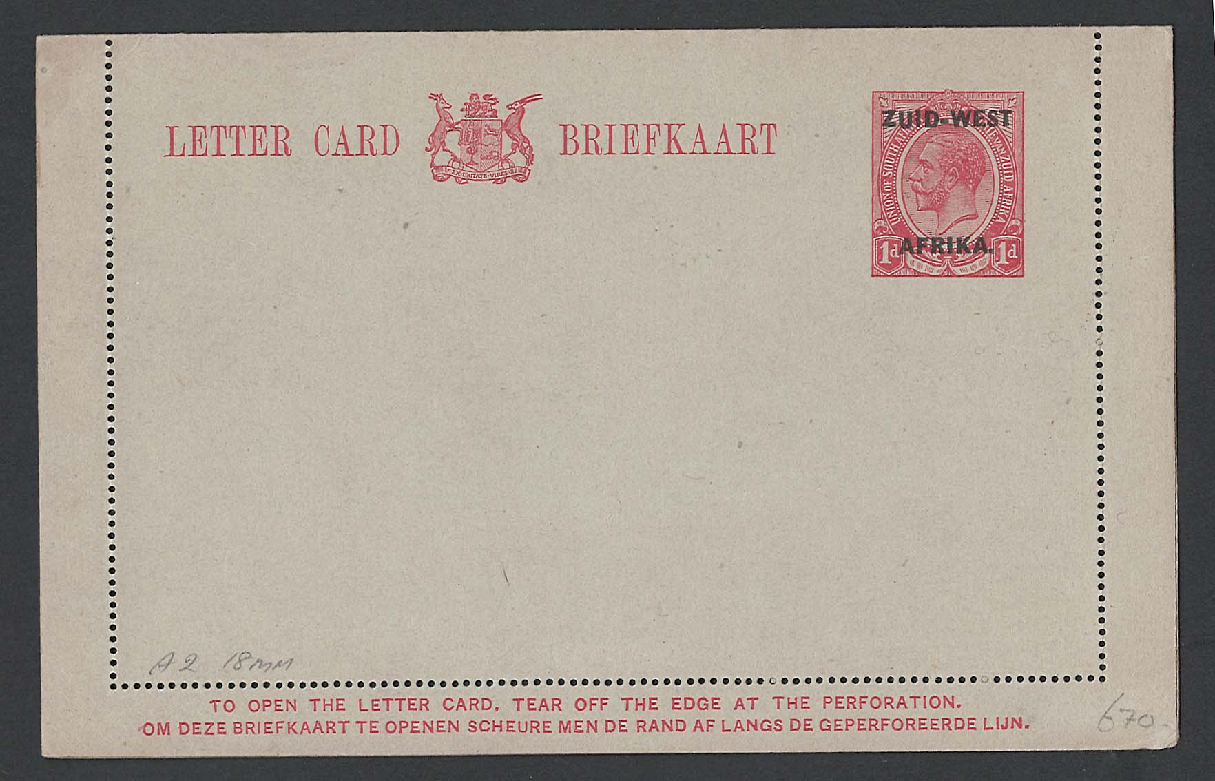 South West Africa 1923 1d ZUID-WEST AFRIKA ovpt Letter Card HG2 fine unused [ref 287bb2348/se/5e2694]