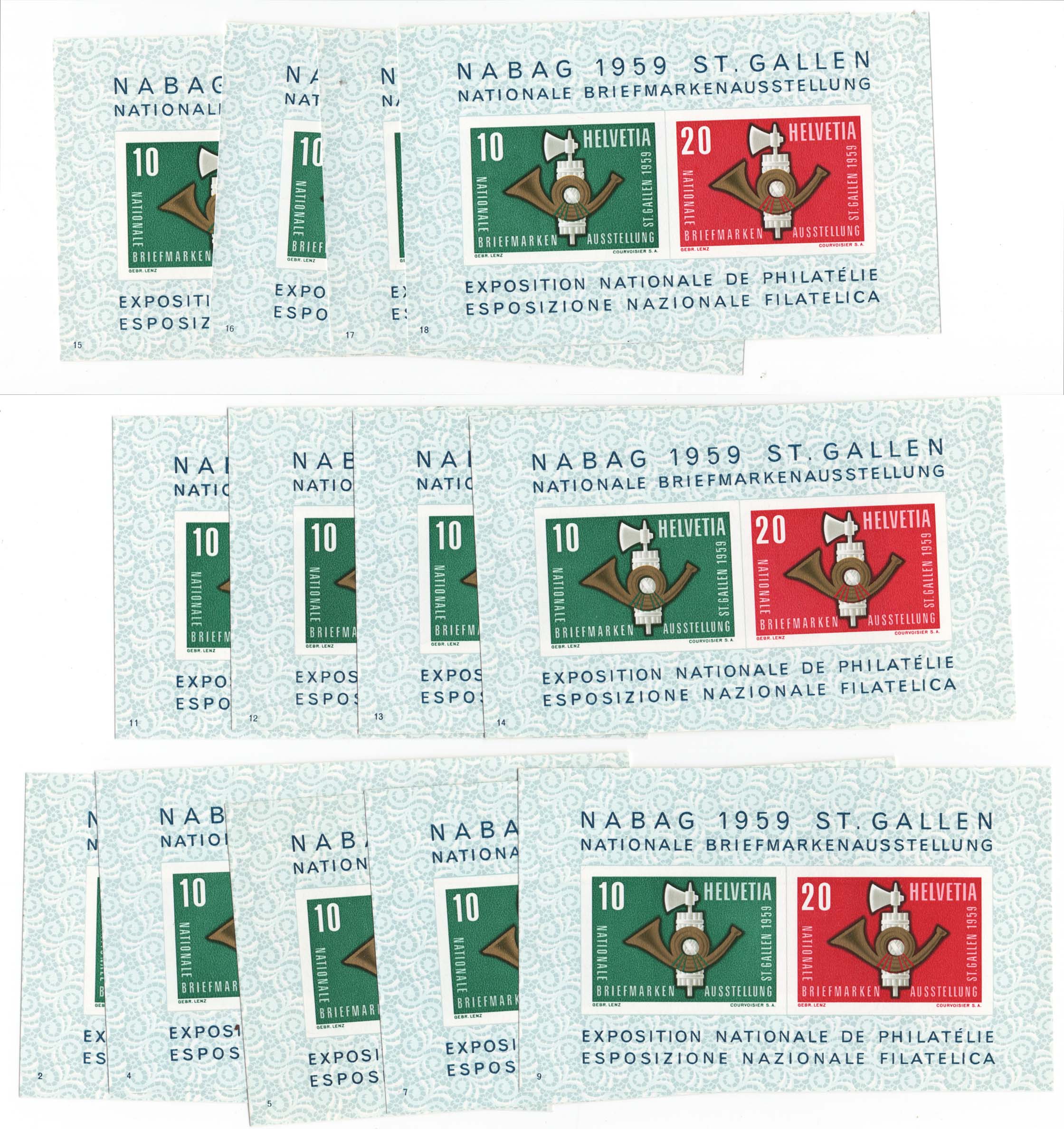 Switzerland 1959 NABAG m/sheet sg600a x 13 copies unmounted mint all with different numbers in bottom left corner cat £273 [ref: 292/1088 saD/6g0363]