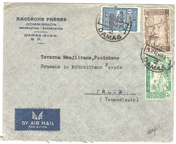 Syria 1940 ‘s neat cover Damascus to Yugoslavia, franked 60p incl 5p fiscal stamp