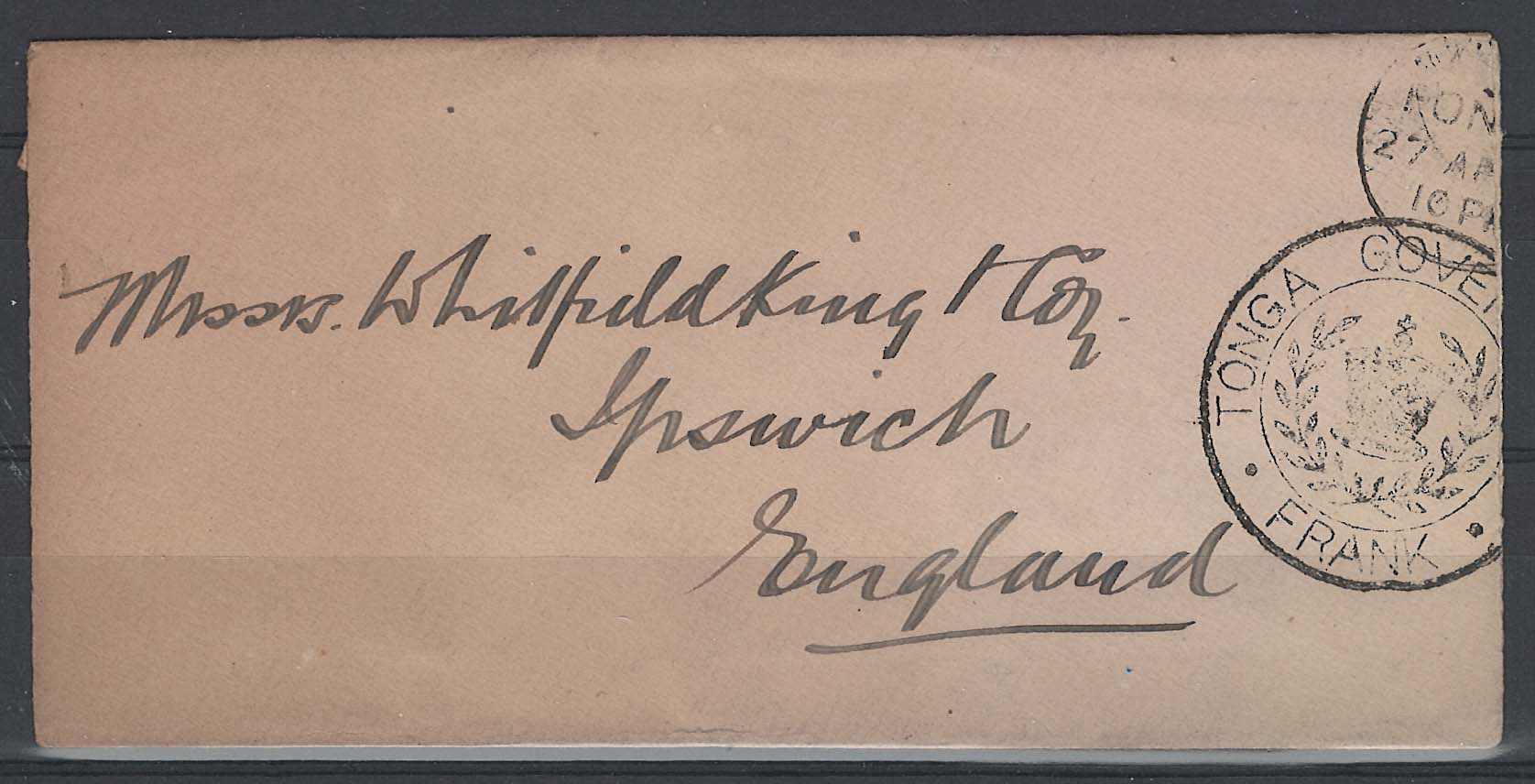 Tonga ?1940s neat cover to Ipswich, fine Tonga Gov’t Frank crown in laurels cancel
