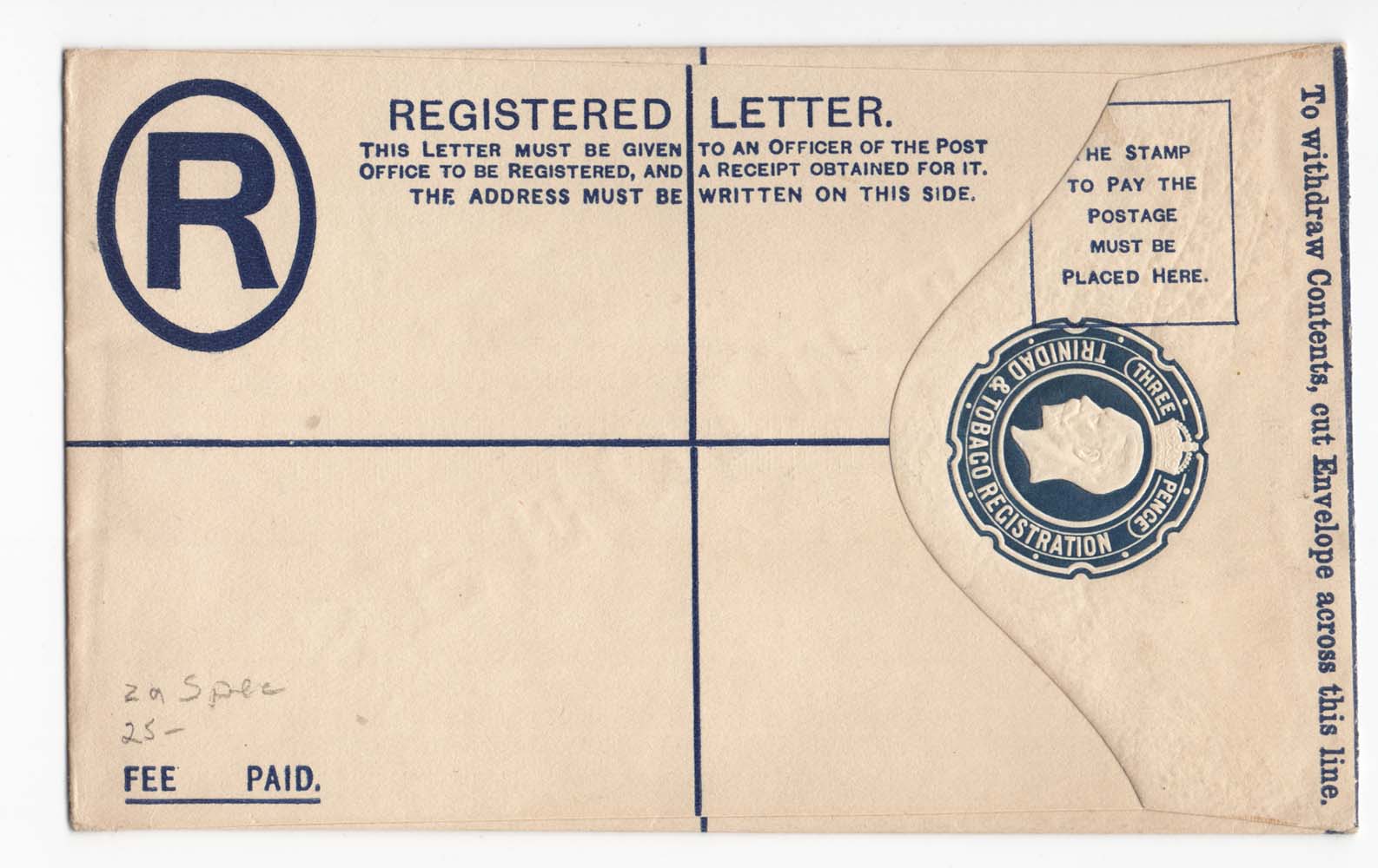 Trinidad & Tobago 1924 3d Reg envelope ovpt SPECIMEN (on reverse) 133x83mm, Thos De La Rue & Co under flap, fine [ref 287bb2469/b84a/9w1018]