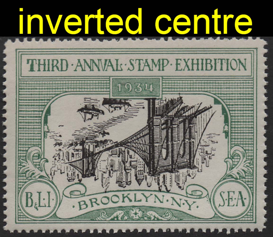 USA 1934 Third Annual Stamp Exhibition label Inverted Centre ERROR, Brooklyn Bridge label unmounted mint scarce Cinderella item