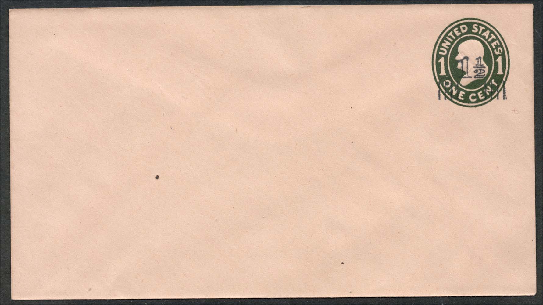 Franklin type U90 Stationery envelope 1½c on 1c green on oriental buff, fine unused entire, Scott U492 cat $800. We believe this is correctly identified but please let us know if it isn’t