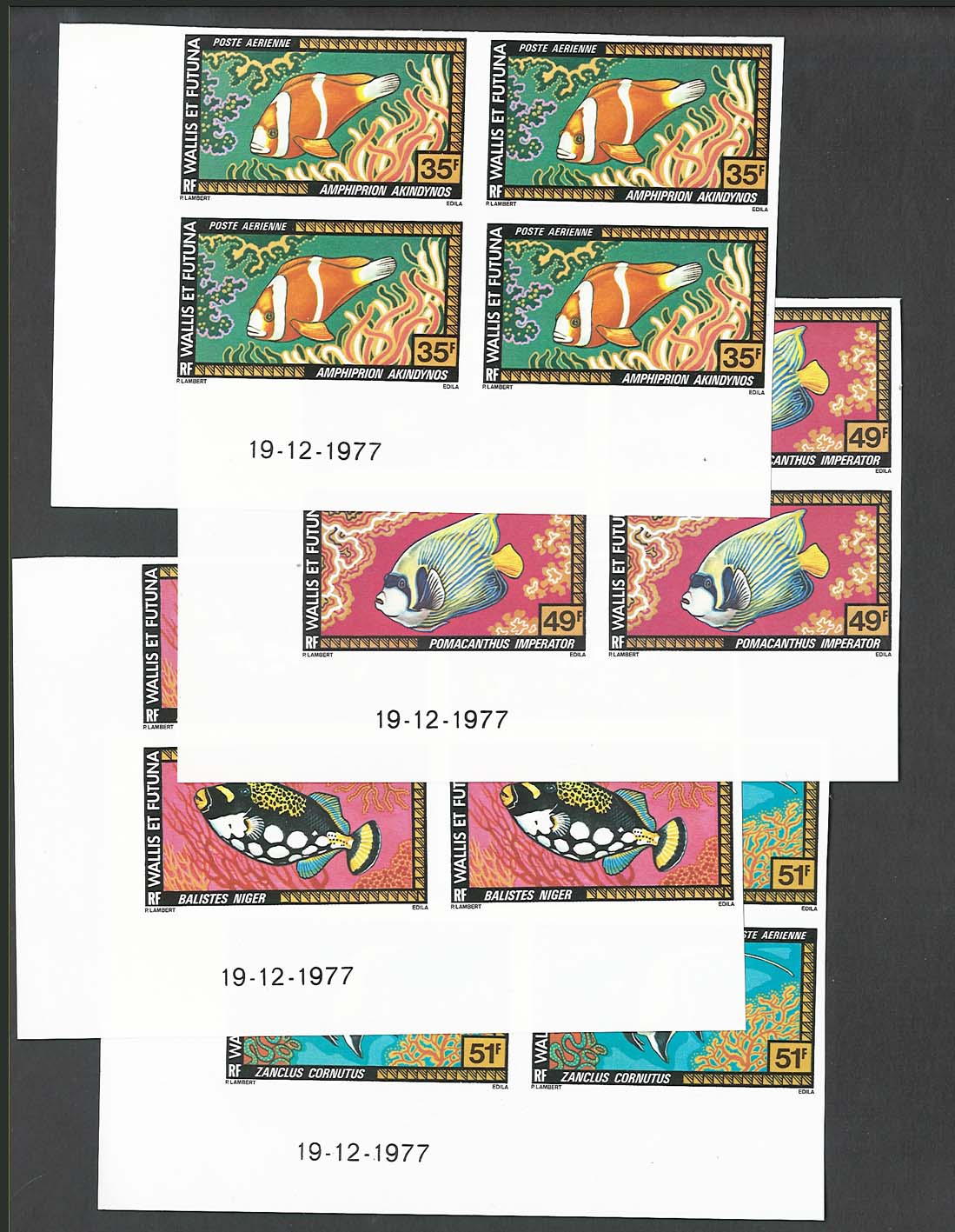 Wallis & Futuna 1978 Fish set, IMPERF, as sg278/81 in um corner blocks of 4